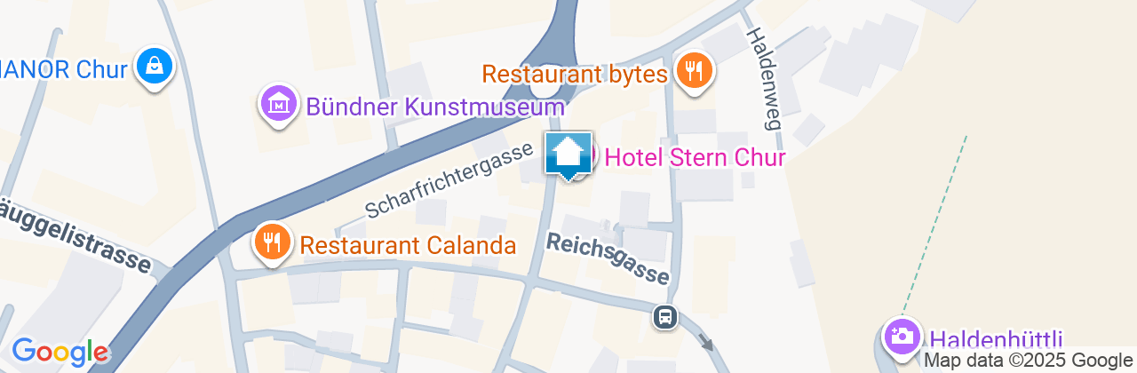 Ankunft mit dem Zug: Vom Bahnhof zu Fuss der Bahnhofstrasse entlang bis zum Postplatz, dort nach links bis zum Kreisel mit den Bäumen. Nach rechts (Reichsgasse) und nach ca. 20 Meter stehen Sie vor dem Hotel Stern in Chur.
